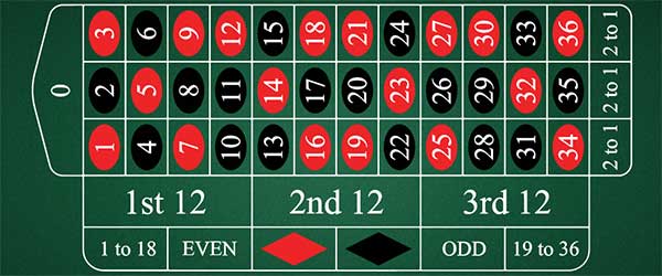 The layout of the betting table lists the numbers and the bets you can place on these numbers:
