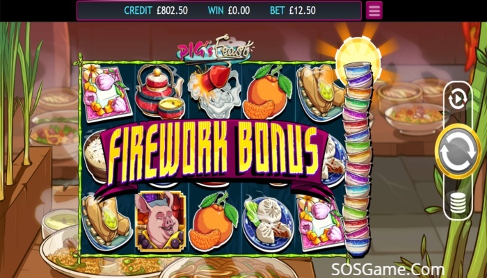 The Firework Bonus is triggered when the bowl stack on the right contains 17 bowls. Crates of firework appear and explode, awarding as much as 100x the total wager. You can win a total of 500x your current wager.