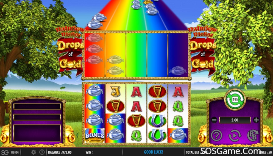 The first feature you will notice is the Rainbow Riches Drops of Gold feature that shows an endless stream of silver and gold pots, the game’s Wild symbols, floating over the reels. These pots fall to the reels and make significant wins. This feature is also activated if the Drop of Gold symbol lands on the fifth reel in the base game.