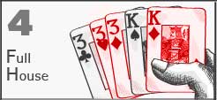 If you get dealt a Full House hand when playing Cyberstud Poker then you have been dealt out the fourth highest paying hand available on this game, and will get a winning payout worth 14 to 1 based on the Call part of your original wager, this will be paid out only if the Dealer Qualifies when his card are revealed.