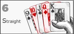 If you get dealt a Straight hand when playing Cyberstud Poker then you have been dealt out the sixth highest paying hand available on this game, and will get a winning payout worth 5 to 1 based on the Call part of your original wager, this will be paid out only if the Dealer Qualifies when his card are revealed.