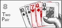 If you get dealt a Two Pairs hand when playing Cyberstud Poker then you have been dealt out the eighth highest paying hand available on this game, and will get a winning payout worth 1 to 1 based on the Call part of your original wager, this will be paid out only if the Dealer Qualifies when his card are revealed.
